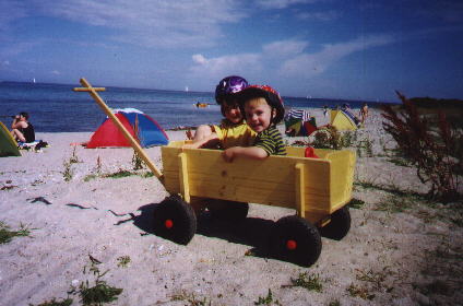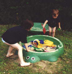 Sandkasten mit Förmchen, Eimer und Schaufeln